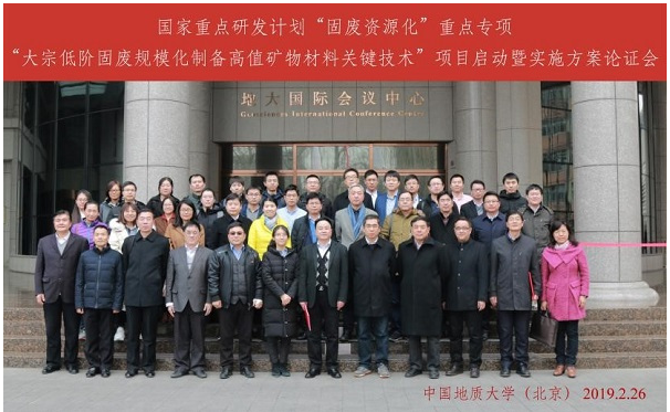 2019年2月26日,国家十三五重点研发计划“固废资源化”重点专项“大宗低阶固废规模化制备高值矿物材料关键技术”项目启动暨实施方案论证会在中国地质大学(北京)国际会议中心召开。